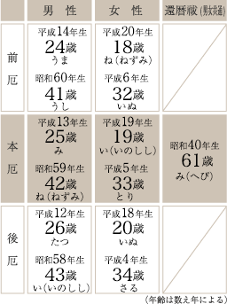 本年が運気低迷の年に当たる方の生れ年。一年の安穏をご祈願し、万事を良い方向に変えましょう。(年齢は数え年による)